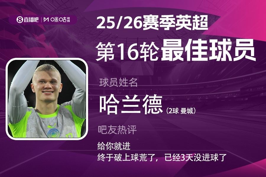 直播吧X咪咕体育|英超第16轮MVP:哈兰德!独中两元尽显射手本色