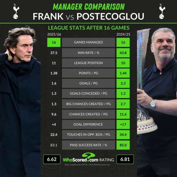 危?弗兰克执教热刺前16轮胜率、进球等数据均不如澳波上赛季同期