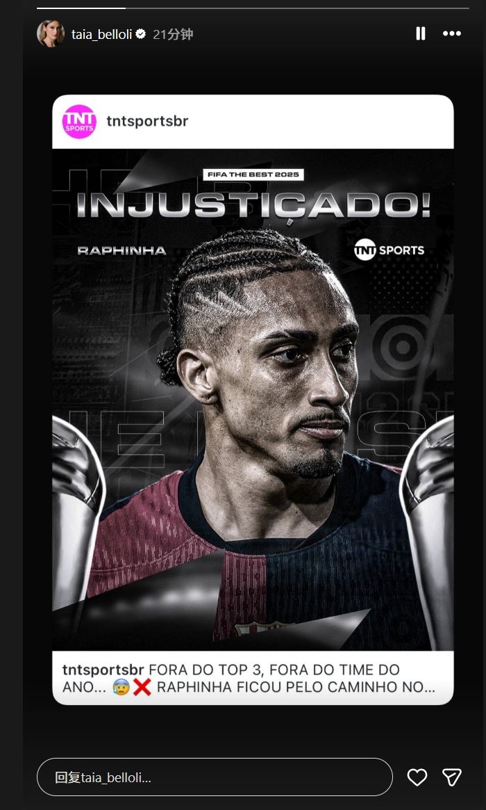 拉菲尼亚无缘FIFA最佳阵,其妻子连发4条动态:演都不演了!
